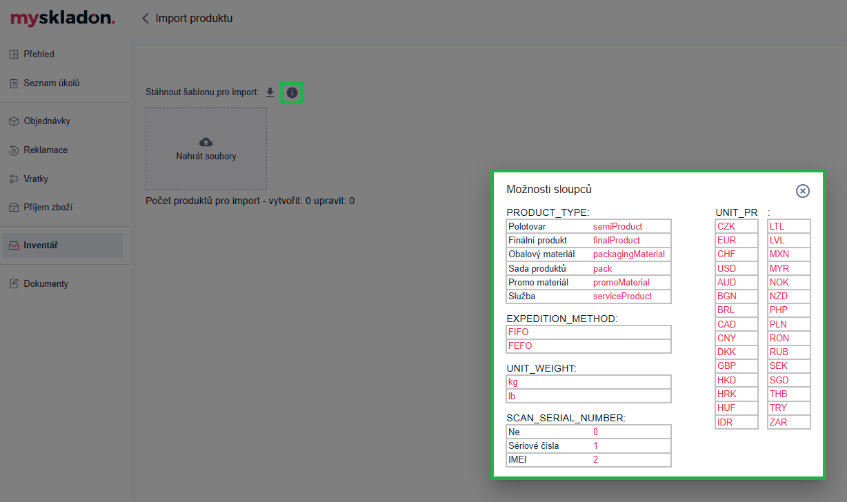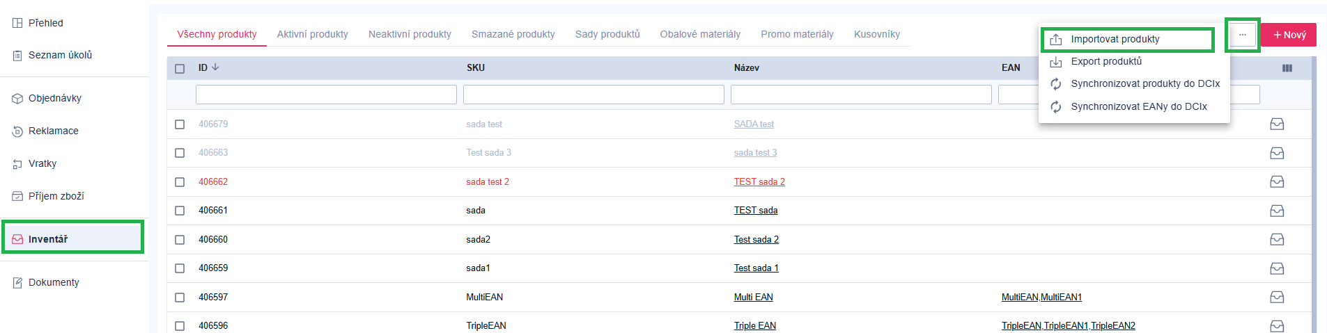 - Importované produkty jsou uloženy a zobrazeny v sekci Inventář