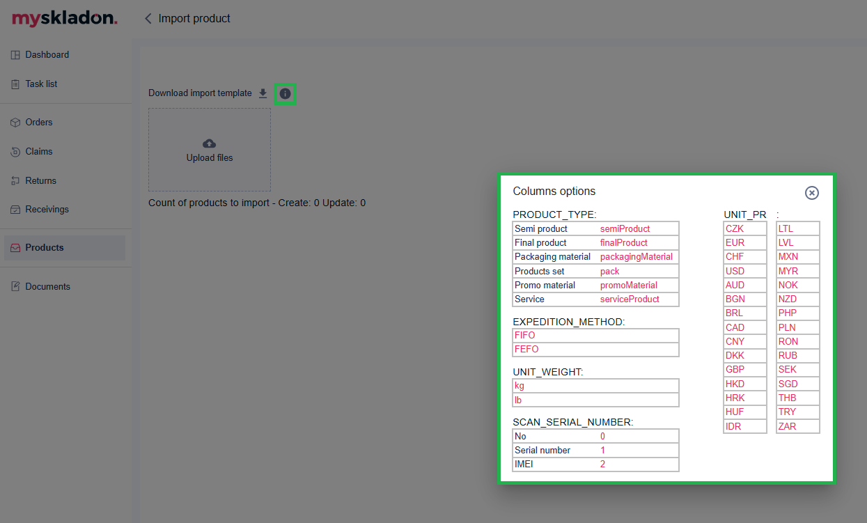 The wrongly uploaded file can be removed from the import by clicking the Delete button - If the individual products are validated as correct, click the Import product button in the upper right corner of the window to import the SKUs / products into the system and then confirm by Ok button