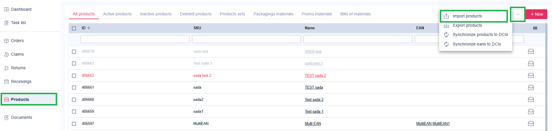 - V horní části středového panelu klikněte na tlačítko Více možností a poté možnost Importovat produkty