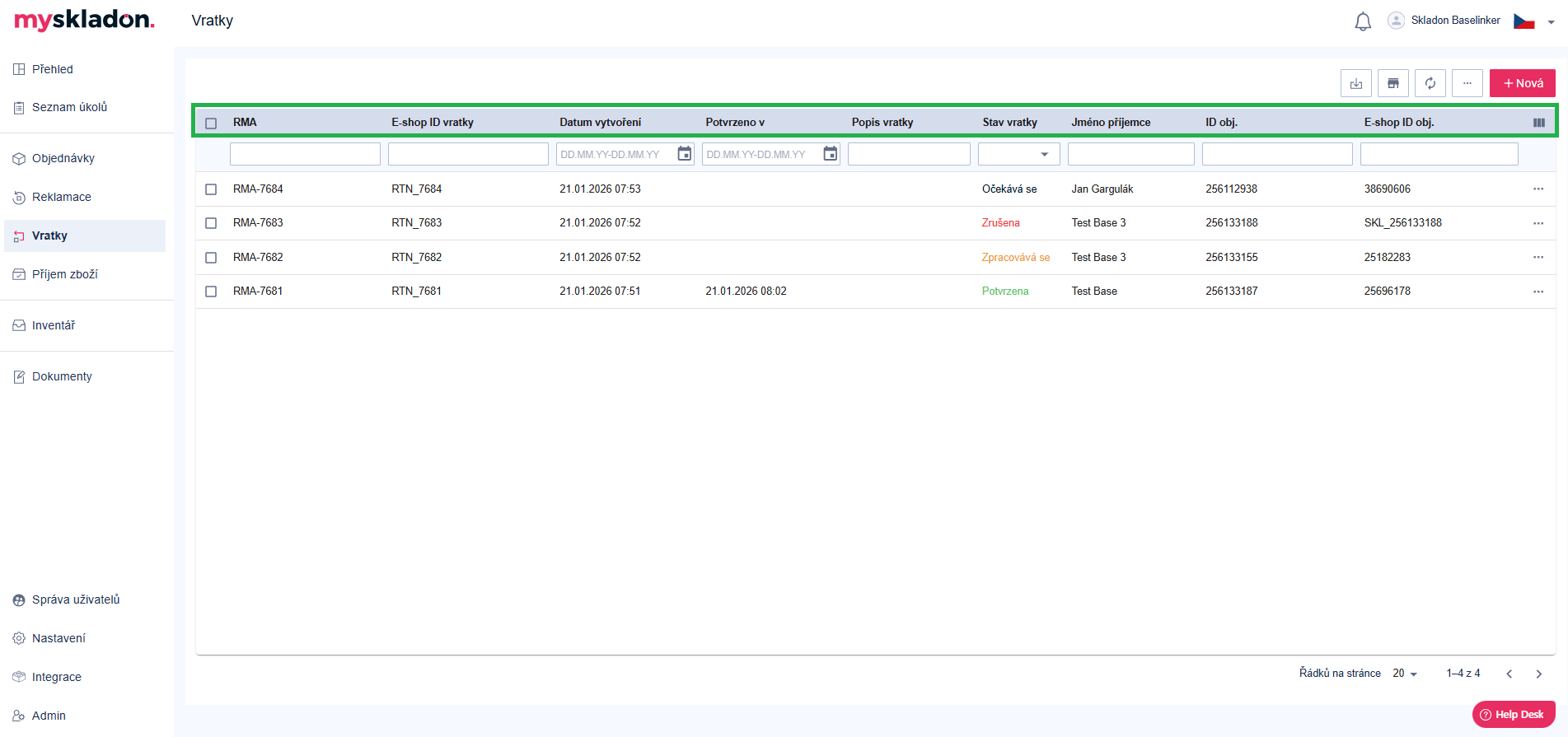 - Stav vratky – aktuální stav vratky (přehled stavů vratek viz kapitola Stavy vratek)