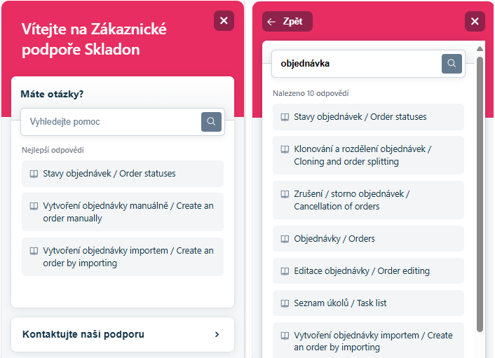 V první řadě má uživatel k dispozici Znalostní bázi, kde může snadno vyhledat pomoc na základě klíčových slov, například "objednávka". Po vyplnění klíčového slova widget nabídne seznam článků obsahující relevantní informace.