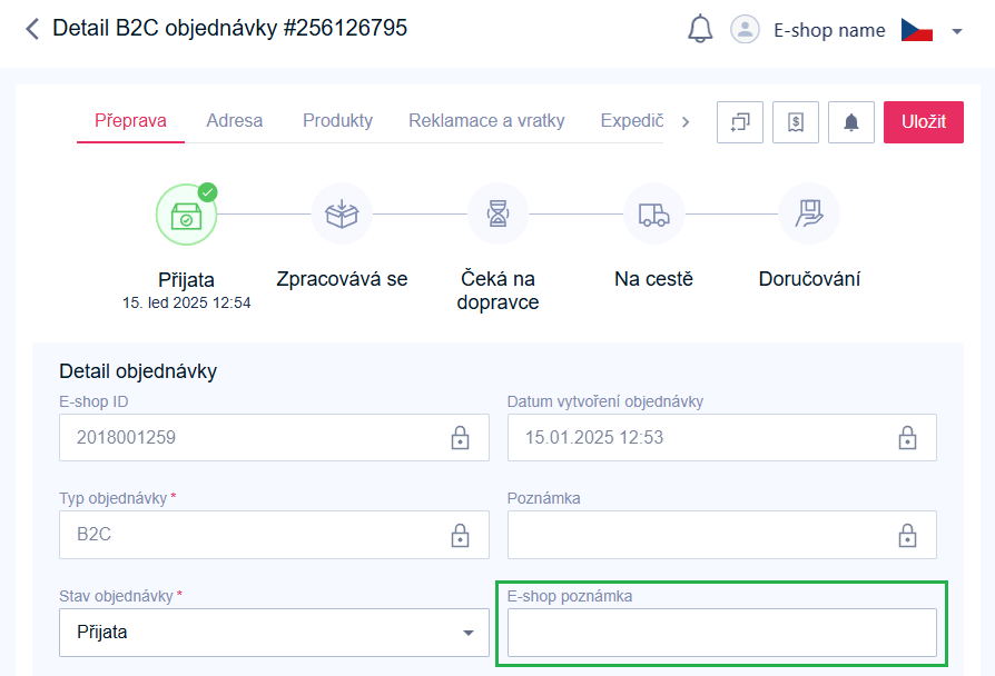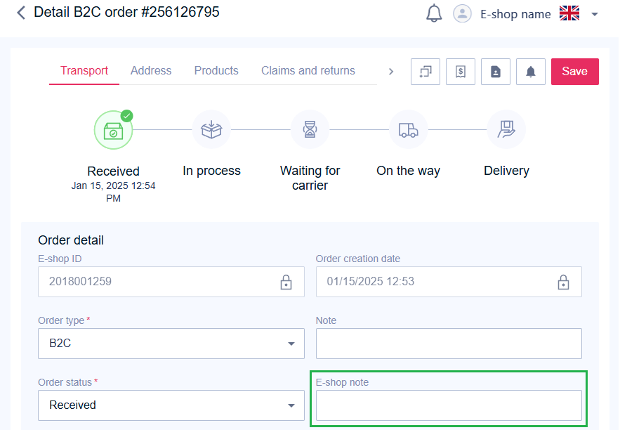 The Note field is on the order, claim and return details and is used for text notes that anyone needs to include for a given order, claim or return - both Skladon employees and users of the given e-shop.