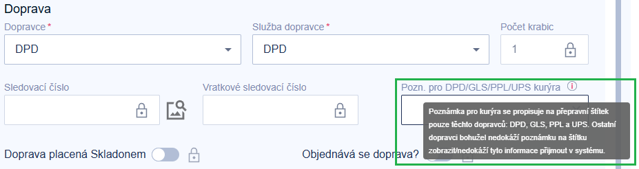 Na detailu objednávky, v sekci Doprava je pole Poznámka pro kurýra - přes ikonu ⓘ pro toto pole si můžete zobrazit podrobné informace: Poznámka pro kurýra se propisuje na přepravní štítek u těchto dopravců: DHL, DPD, GLS, PPL CZ a UPS. Ostatní dopravci (PBH, PPL EU, Zásilkovna) nedokážou poznámku na štítku zobrazit / nedokážou tyto informace přijmout v systému.