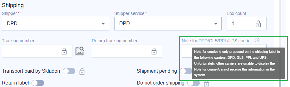In the order detail, in the Shipping section, there is a field Note for courier - you can view detailed information for this field by clicking on the ⓘ icon: Note for courier is proposed on the shipping label to the following carriers: DHL, DPD, GLS, PPL CZ and UPS. Other shippers (PBH, PPL EU, Zásilkovna / Packeta) are unable to display the Note for courier / cannot receive this information in the system.