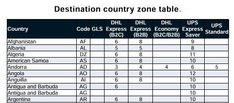 Would you like to check the price of a shipment abroad? Look up the zone number of the specific destination country in the Carriers Zones table to find the shipping price in the price list sent to you by your sales representative.