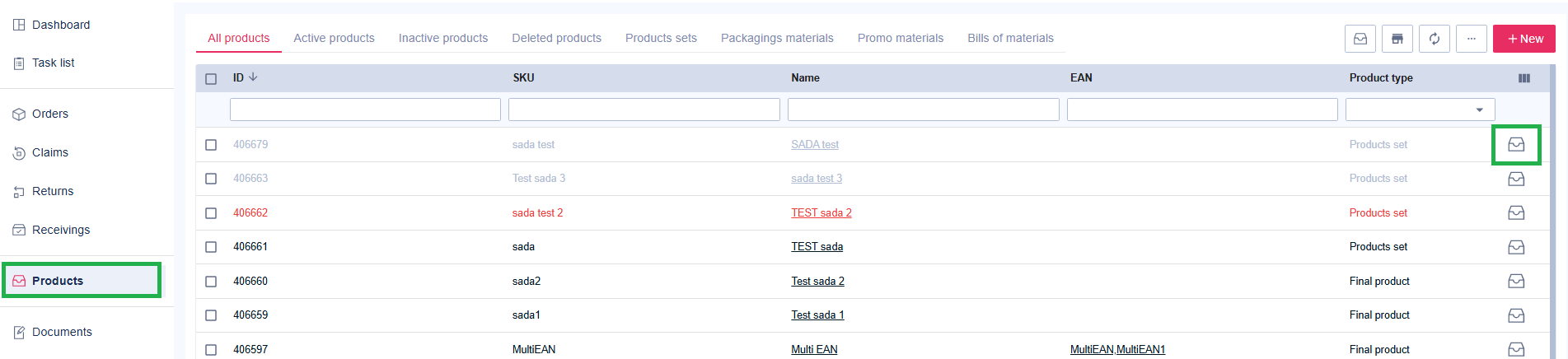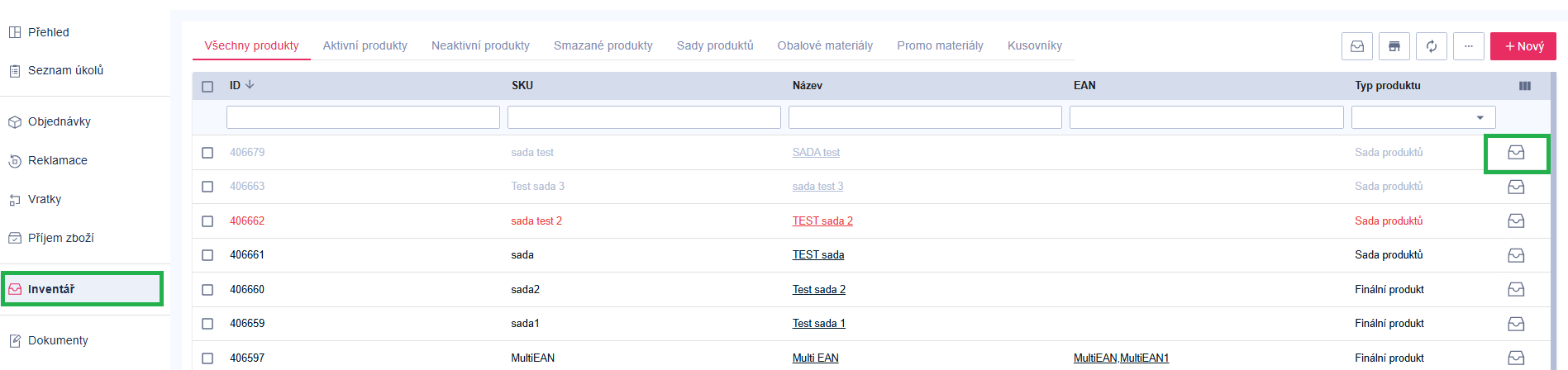 - V sekci Inventář klikněte na tlačítko Detail produktu na konci řádku u konkrétního SKU, u kterého si přejete zobrazit skladové pohyby.